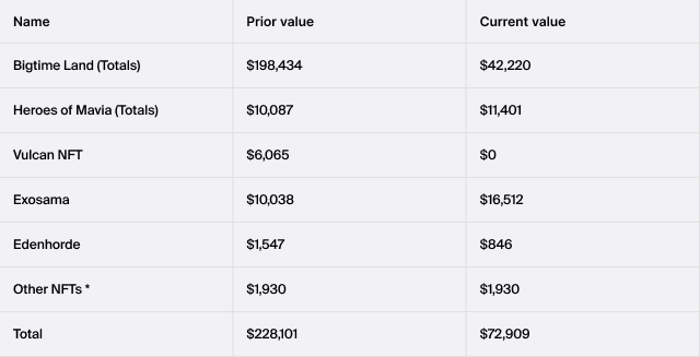 The Treasury dashboard includes a section for “Other Investments”, split across the three categories of liquid crypto assets, NFTs and venture investments. Since the start of the year and during the last quarter, some of the portfolio projects have been underperforming and have seen a significant loss of value. The Other Investments line item aggregates the costs and current realizable value of those projects that have underperformed and thus will usually reflect a significant loss relative to the cost amount.