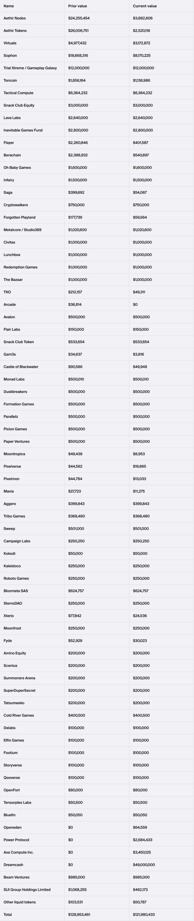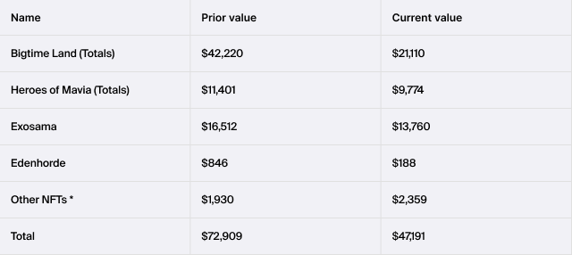 The Treasury dashboard includes a section for “Other Investments”, split across the three categories of liquid crypto assets, NFTs and venture investments. Since the start of the year and during the last quarter, some of the portfolio projects have been underperforming and have seen a significant loss of value. The Other Investments line item aggregates the costs and current realizable value of those projects that have underperformed and thus will usually reflect a significant loss relative to the cost amount.