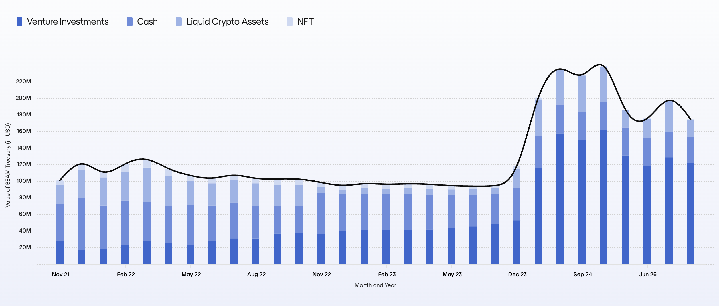 As of December 31st 2025, the Treasury balance is valued at $174,679,179. In addition, the Treasury contains 9,926,852,982.50 BEAM tokens valued at $26.86m.